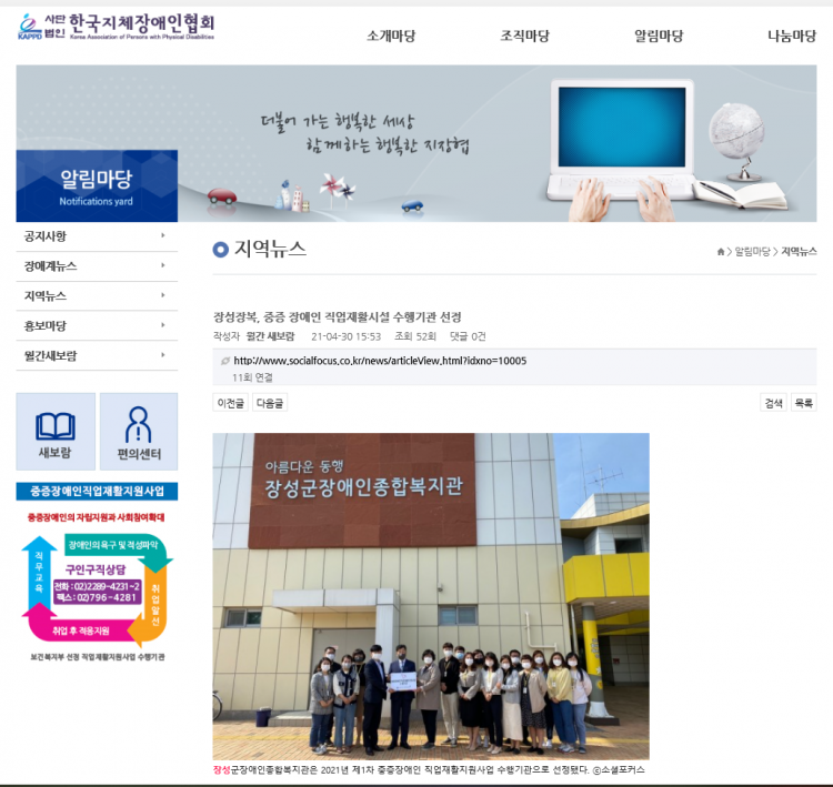 ◎ 기사명 : 장성장복, 중증 장애인 직업재활시설 수행기관 선정