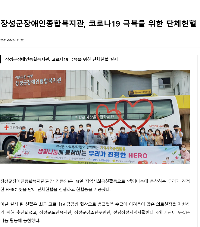 ◎ 기사명 : 장성군장애인종합복지관, 코로나19 극복을 위한 단체헌혈 실시