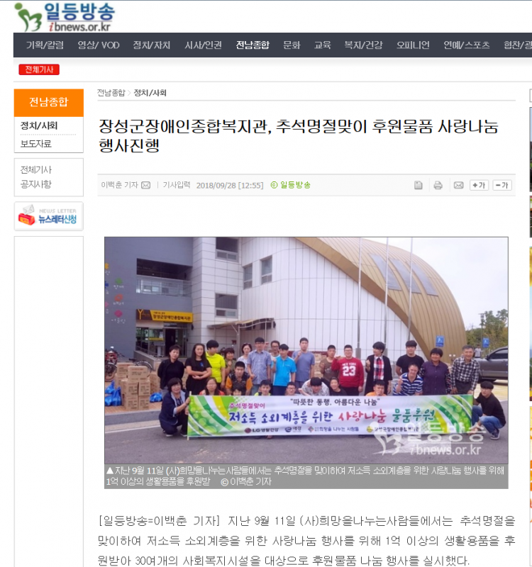 | 다음글 장성방송국-장성군장애인종합복지관, 추석명절맞이 후원물품 사랑나눔 행사진행 |