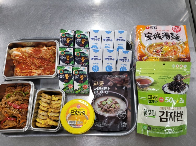 ● 15명: 제육볶음, 해물동그랑땡, 배추김치, 설렁탕 1ea, 단호박죽 1ea, 김자반 1ea, 우유 6ea, 두유 6ea, 안성탕면 1ea(5개입)