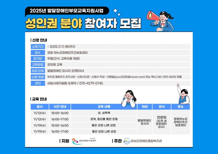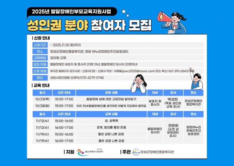 장성군장애인종합복지관에서는 전남발달장애인지원센터에서 지원하는 "2025년 발달장애인 부모교육지원사업"에 선정되어 발달장애 자녀를 둔 부모와 자녀, 발달장애인을 지원하는 시설 종사자 등에게 건강한 성생활 지원, 사회적 통합 등 더 풍부하고 만족스러운 삶을 영위할 수 있도록 전문정보 및 교육을 지원하고자 하니 많은 관심과 참여 부탁드립니다.