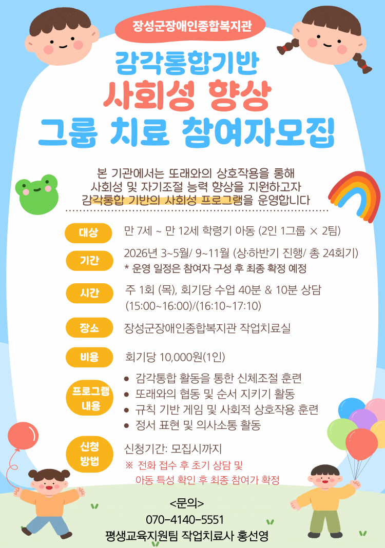 2026년 학령기 아동들(만 7세~만 12세)을 대상으로 사회성 향상 프로그램 운영할 계획입니다~ 많은 참여 부탁드립니다~