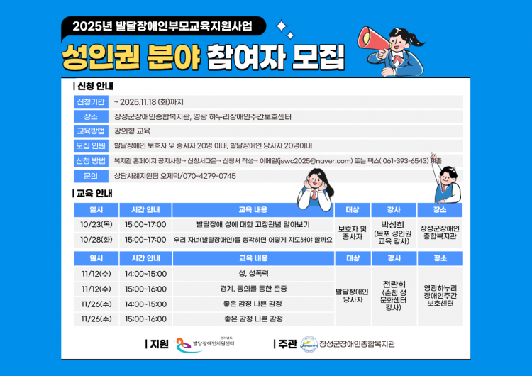 장성군장애인종합복지관에서는 전남발달장애인지원센터에서 지원하는 "2025년 발달장애인 부모교육지원사업"에 선정되어 발달장애 자녀를 둔 부모와 자녀, 발달장애인을 지원하는 시설 종사자 등에게 건강한 성생활 지원, 사회적 통합 등 더 풍부하고 만족스러운 삶을 영위할 수 있도록 전문정보 및 교육을 지원하고자 하니 많은 관심과 참여 부탁드립니다.