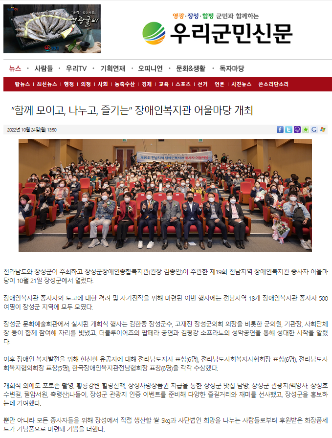 | 이전글 장성투데이-장성장애인복지관 이수현, 장애인체전서 동메달 |