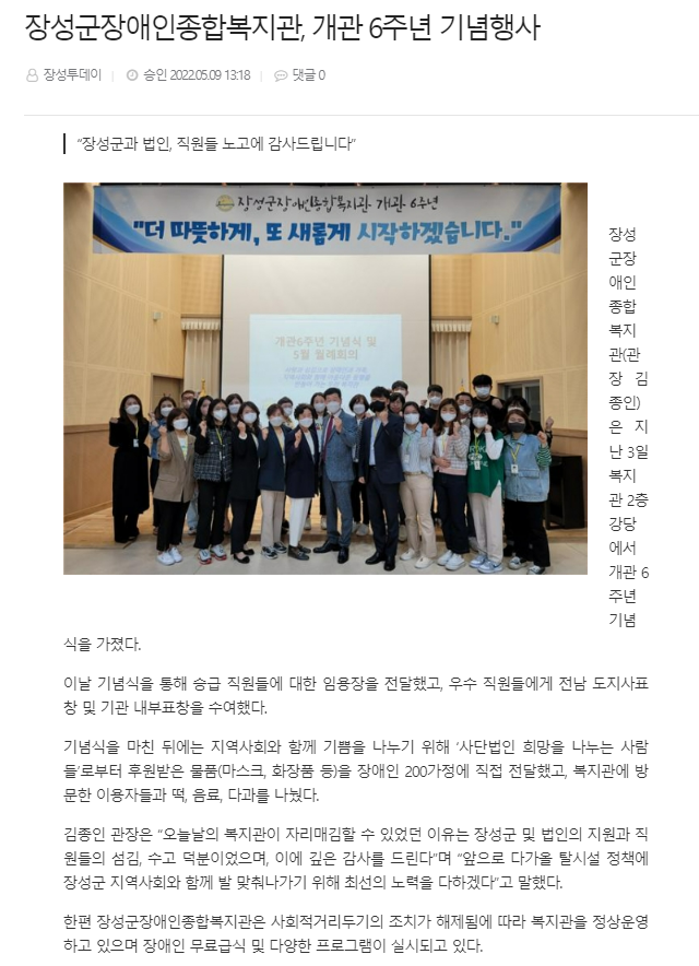 | 다음글 전남목포신문-장성군장애인종합복지관, 개관 6주년 기념 행사 펼쳐 |