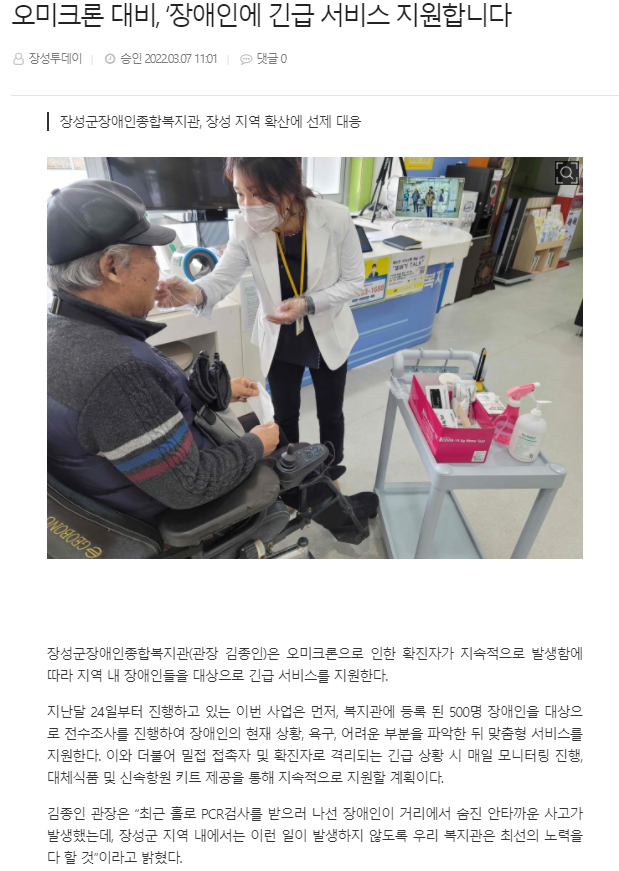 | 다음글 대한기자협회-장성군장애인종합복지관, 지역사회 오미크론 확산 대응 장애인 긴급 서비스 지원 |