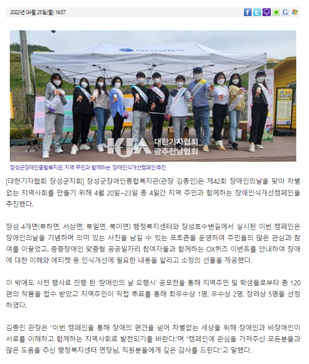 | 다음글 전남도민신문-장성군장애인종합복지관, 지역 주민과 함께하는 ‘장애인식개선캠페인’추진 |