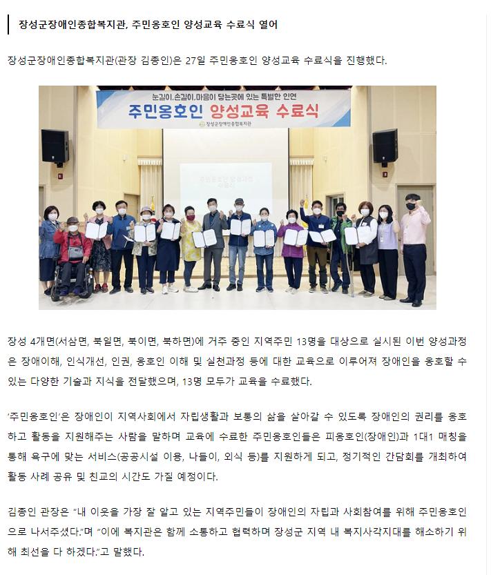 | 이전글 시사종합신문-장성군장애인종합복지관, 주민옹호인 양성교육 수료식 열어 |