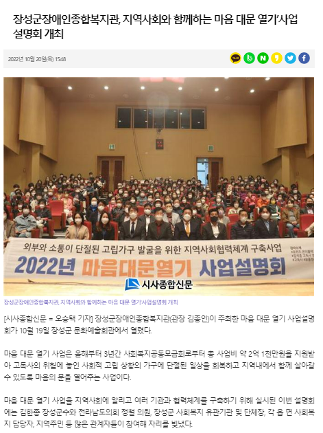 | 이전글 전남목포신문-장성군장애인종합복지관, 지역사회와 함께하는‘마음 대문 열기’사업설명회 개최 |