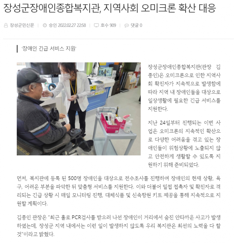 | 다음글 호남타임즈-장성군장애인종합복지관, ‘장애인 긴급 서비스 지원’ 실시 |