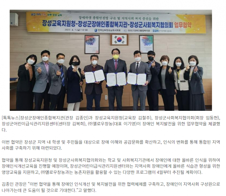 | 다음글 호남매일뉴스-장성군장애인종합복지관, 장애인 복지발전을 위한 업무협약 체결 |
