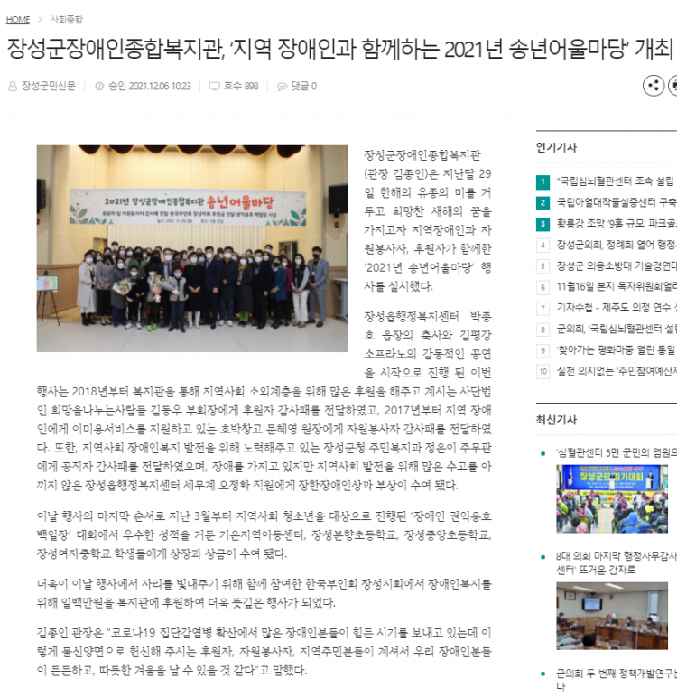 ◎ 기사명 : 장성군장애인종합복지관, ‘지역 장애인과 함께하는 2021년 송년어울마당’ 개최