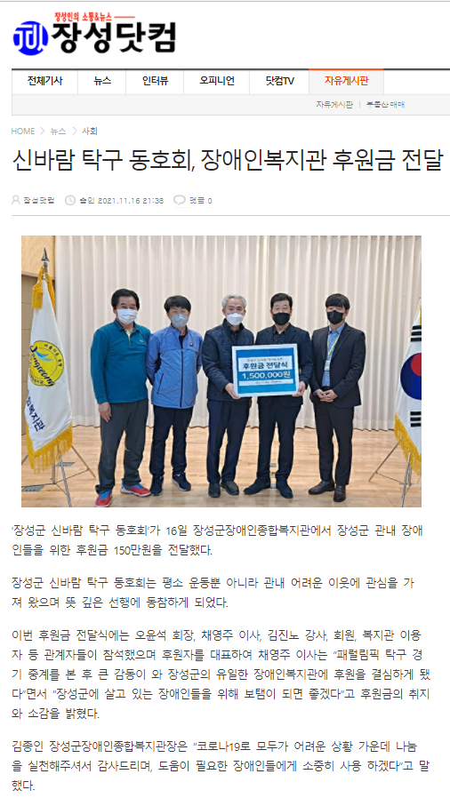 ◎ 기사명 : 신바람 탁구 동호회, 장애인복지관 후원금 전달