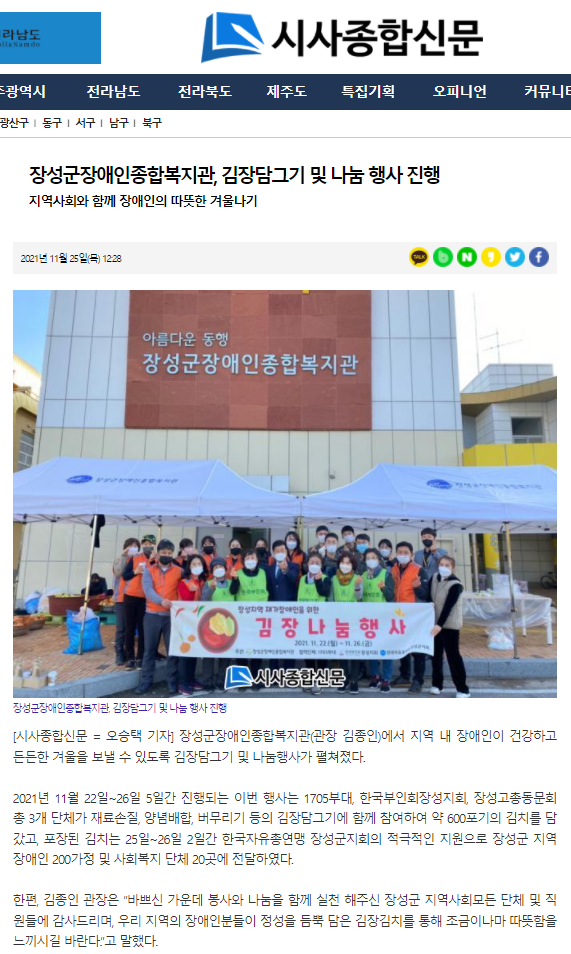 ◎ 기사명 : 장성군장애인종합복지관, 김장담그기 및 나눔 행사 진행