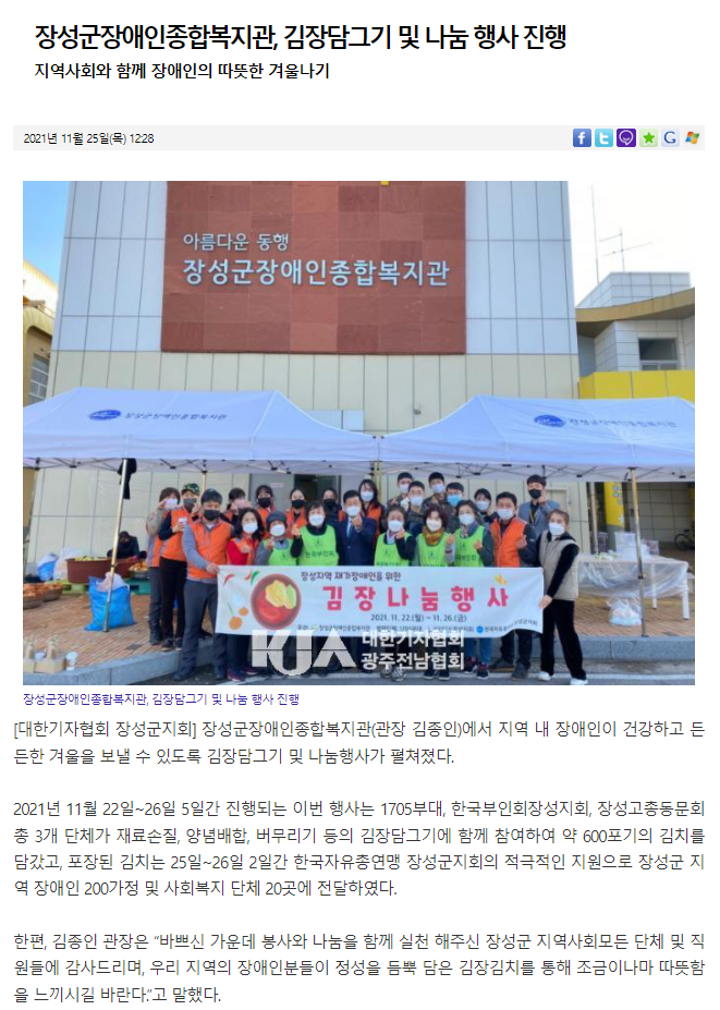◎ 기사명 : 장성군장애인종합복지관, 김장담그기 및 나눔 행사 진행