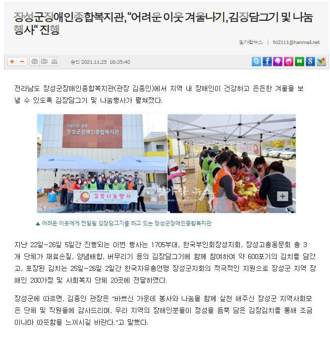 ◎ 기사명 : 장성군장애인종합복지관, “어려운 이웃 겨울나기, 김장담그기 및 나눔행사“ 진행