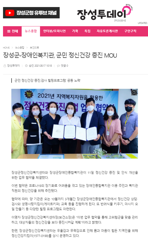 ◎ 기사명 : 장성군-장애인복지관, 군민 정신건강 증진 MOU