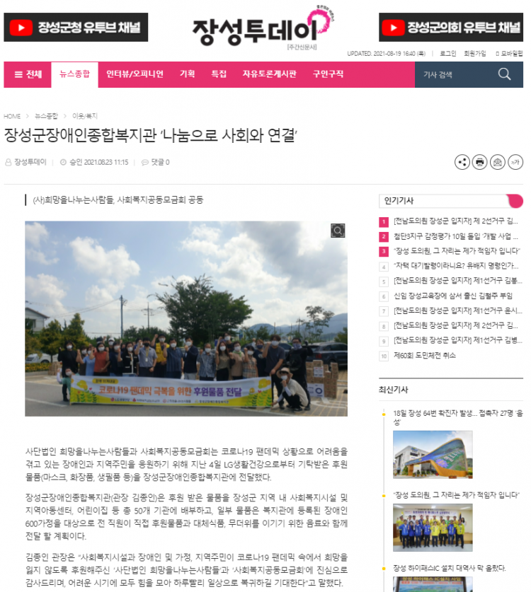 ◎ 기사명 : 장성군장애인종합복지관 ‘나눔으로 사회와 연결’