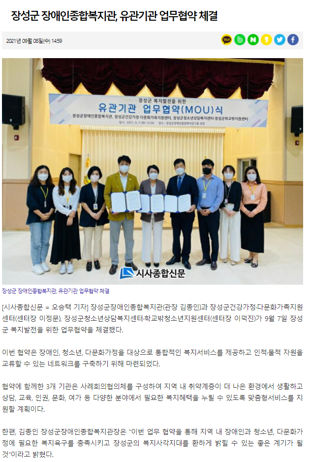 ◎ 기사명 : 장성군 장애인종합복지관, 유관기관 업무협약 체결