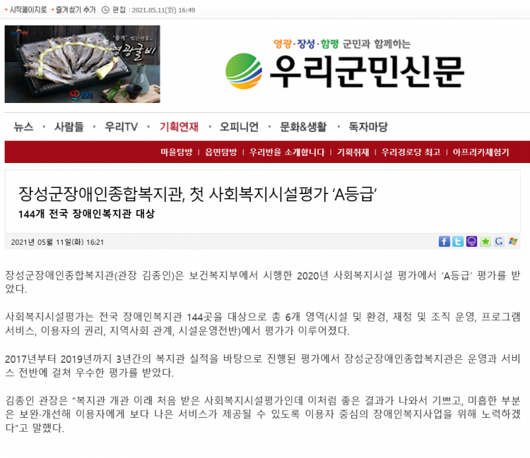 ◎ 기사명 : 장성군장애인종합복지관, 첫 사회복지시설평가에서 ‘A등급’