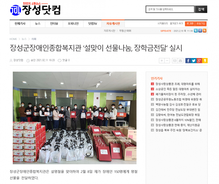 | 다음글 장성군민신문-장성군장애인종합복지관 ‘설맞이 선물나눔, 장학금전달’ 실시 |