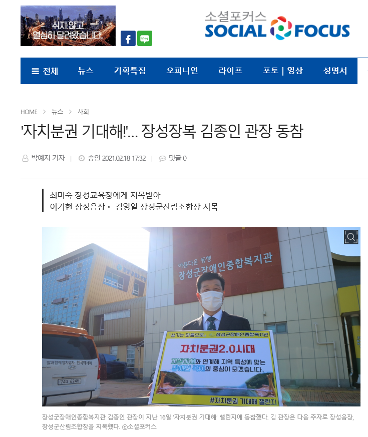 | 다음글 장성닷컴 -김종인 장애인종합복지관장 ‘자치분권 기대해’ 챌린지 동참 |