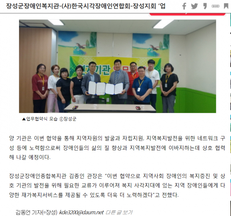 ◎ 기사명 : 장성군장애인복지관-(사)한국시각장애인연합회-장성지회 ‘업무협약’ 체결