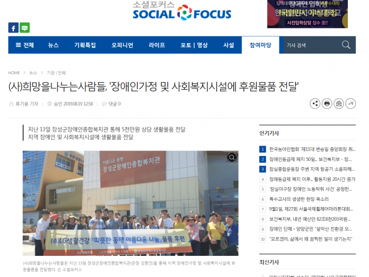 ◎ 기사명 : (사)희망을나누는사람들, '장애인가정 및 사회복지시설에 후원물품 전달'