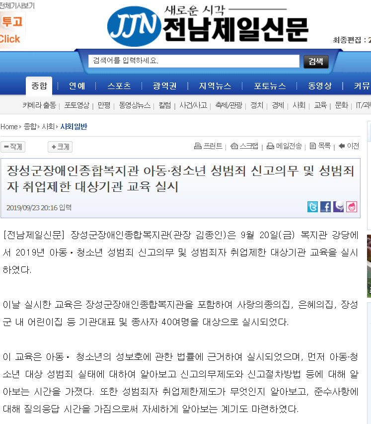 | 다음글 전남인터넷신문-장성군장애인종합복지관 아동‧청소년 성범죄신고의무 및 성범죄자 취업제한대상기관교육 |