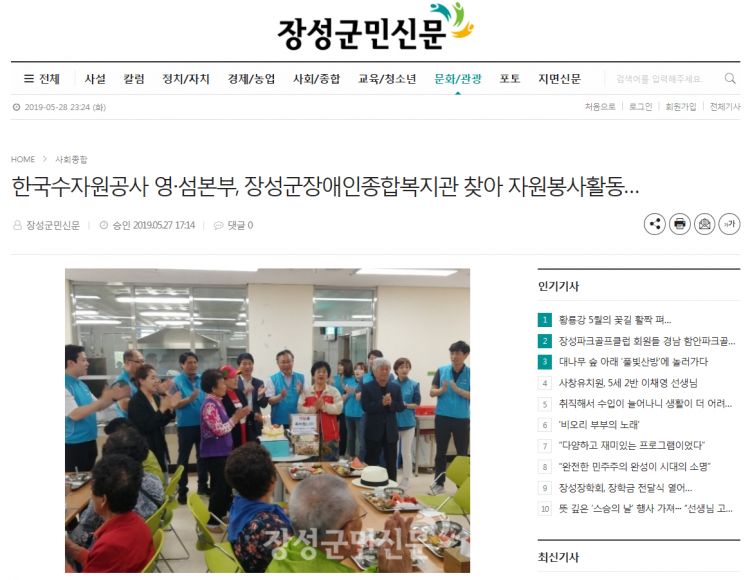 ◎ 기사명 : 한국수자원공사 영‧섬본부, 장성군장애인종합복지관 찾아 자원봉사활동…