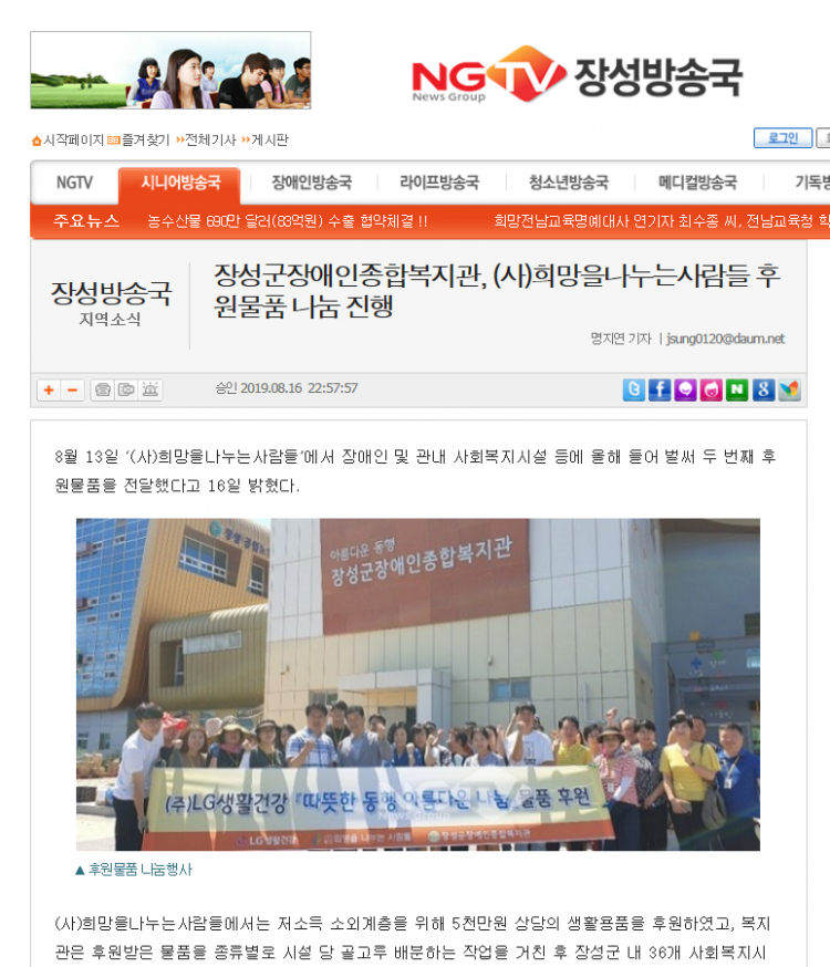 | 다음글 일등방송-장성군장애인종합복지관,(사)희망을 나누는 사람들 후원물품 나눔 진행 |