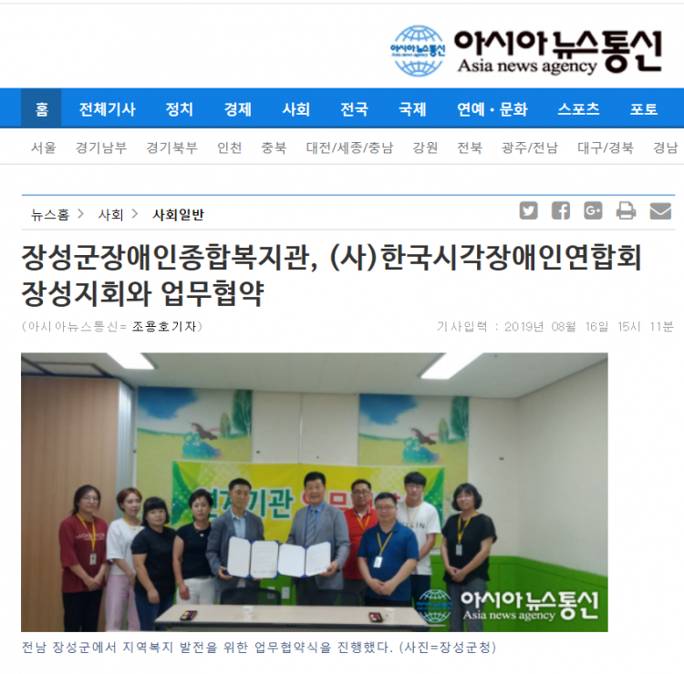 ◎ 기사명 : 장성군장애인종합복지관, (사)한국시각장애인연합회 장성지회와 업무협약