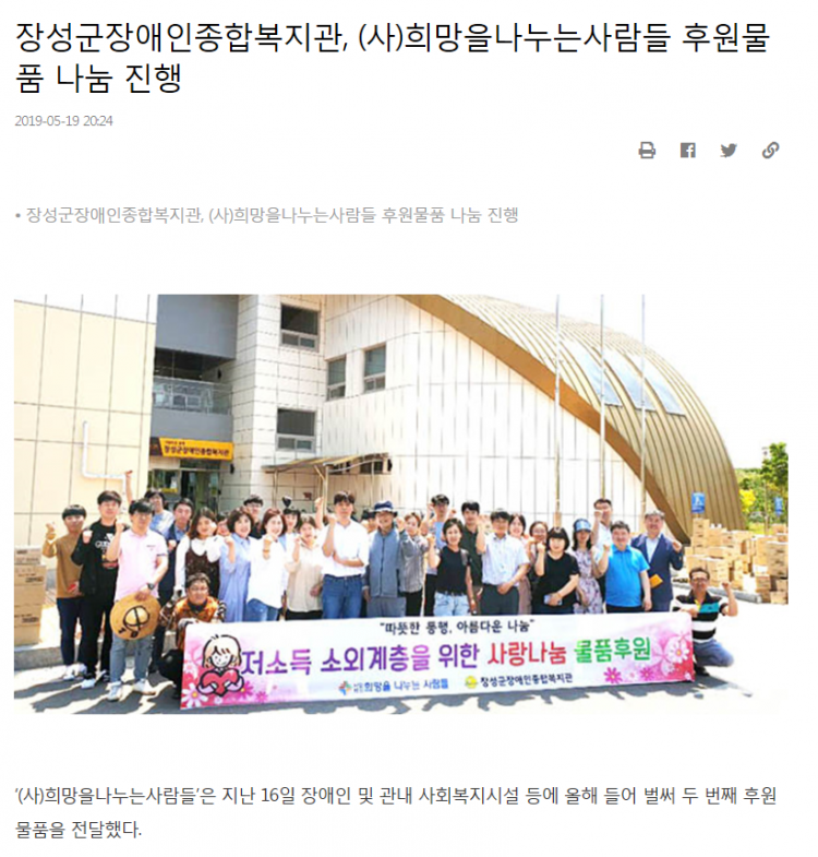 ◎ 기사명 : 장성군장애인종합복지관, (사)희망을나누는사람들 후원물품 나눔 진행