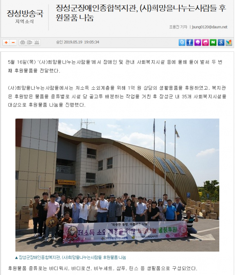 ◎ 기사명 : 장성군장애인종합복지관, (사)희망을나누는사람들 후원물품 나눔