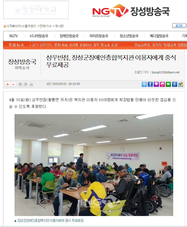 ◎ 기사명 : 상우반점, 장성군장애인종합복지관 이용자에게 중식 무료제공