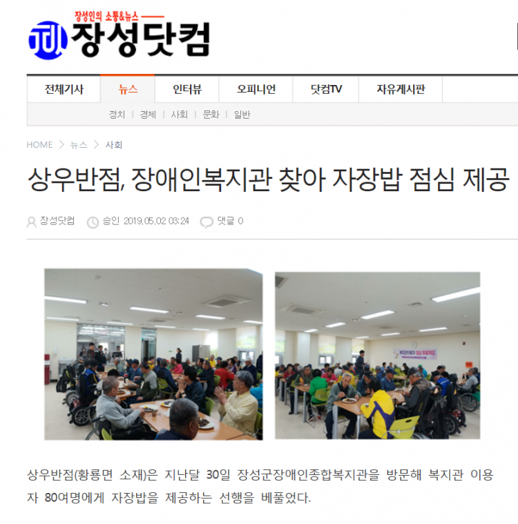 | 이전글 중앙통신뉴스-상우반점, 장성군장애인종합복지관 이용자 중식 후원 |