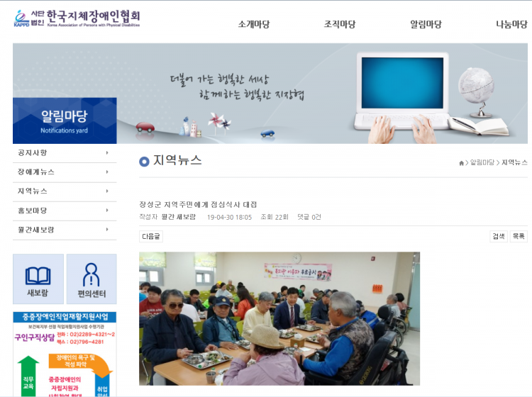 | 다음글 한국지체장애인협회-장성군장애인종합복지관, 보장구 세척서비스 진행 |
