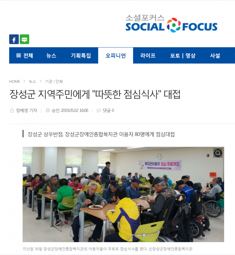 ◎ 기사명 : 장성군 지역주민에게 "따뜻한 점심식사" 대접
