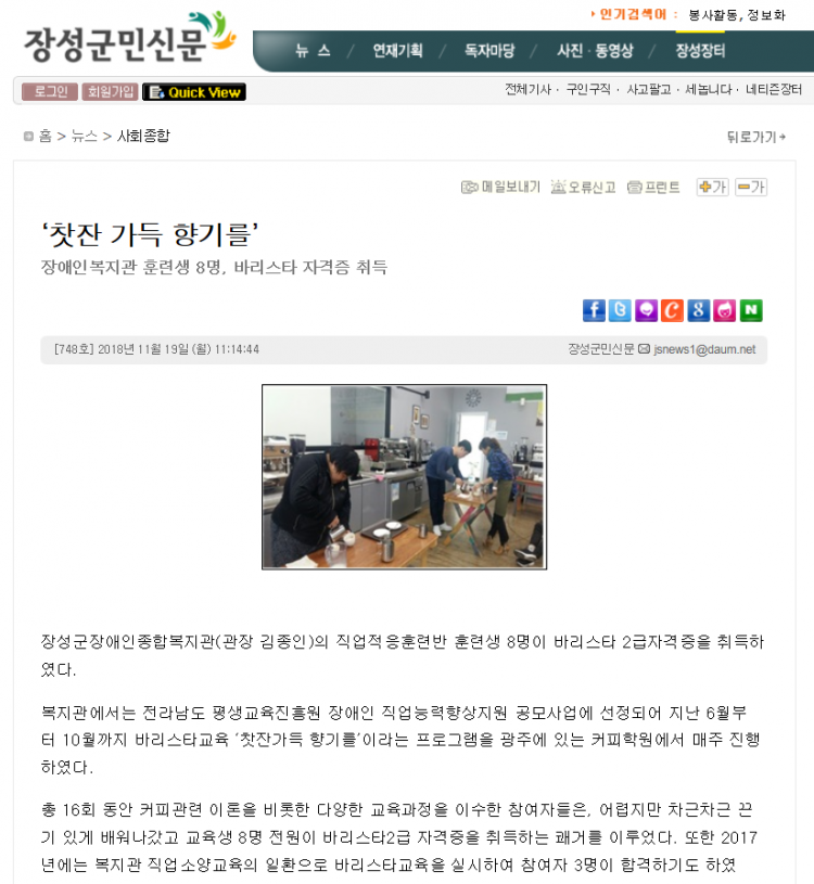 | 이전글 우리군민신문-장성 장애인복지관, 바리스타 2급 자격증 취득 |