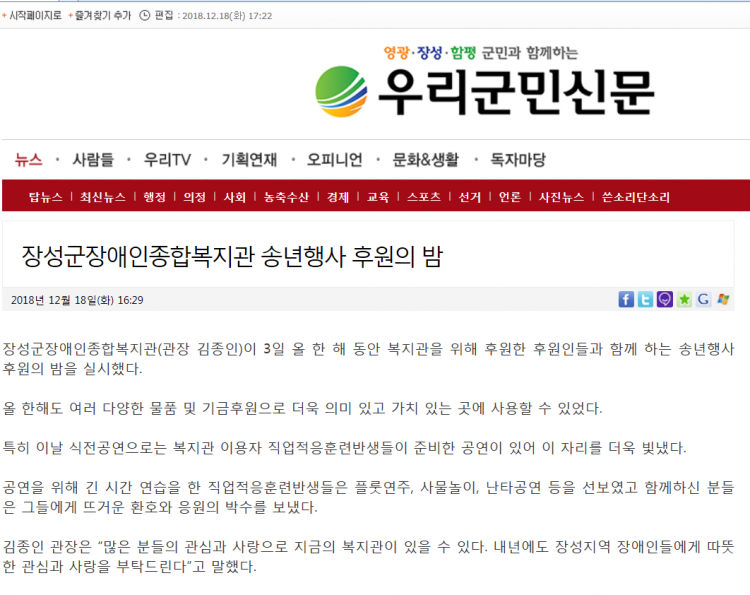 우리군민신문-장성군장애인종합복지관 송년행사 후원의 밤