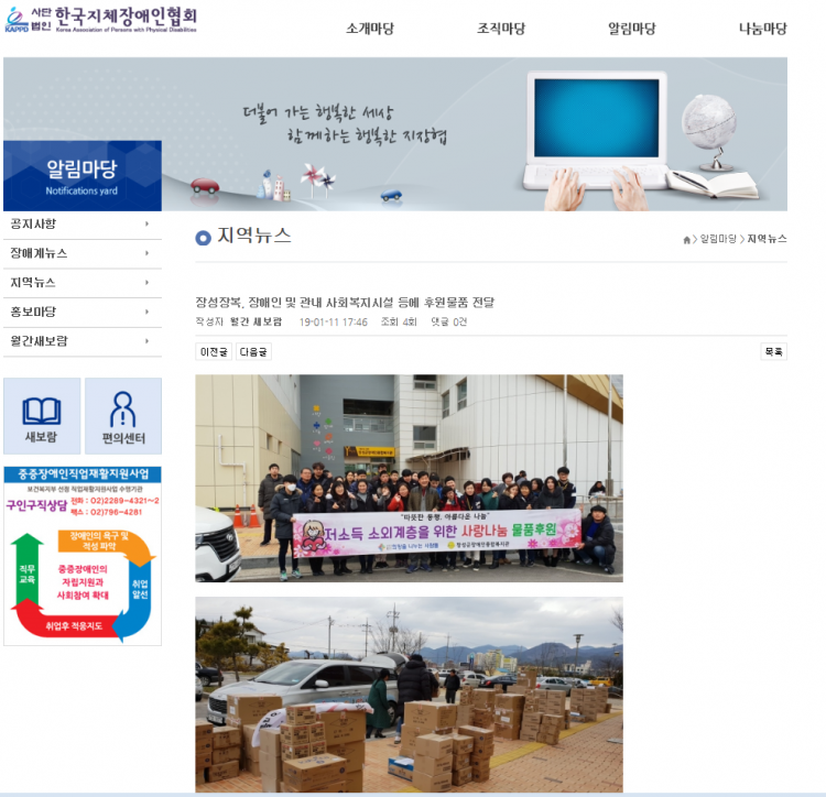 | 이전글 KNS뉴스통신-장성군장애인종합복지관, 장애인 및 관내 사회복지시설 후원물품 전달 |