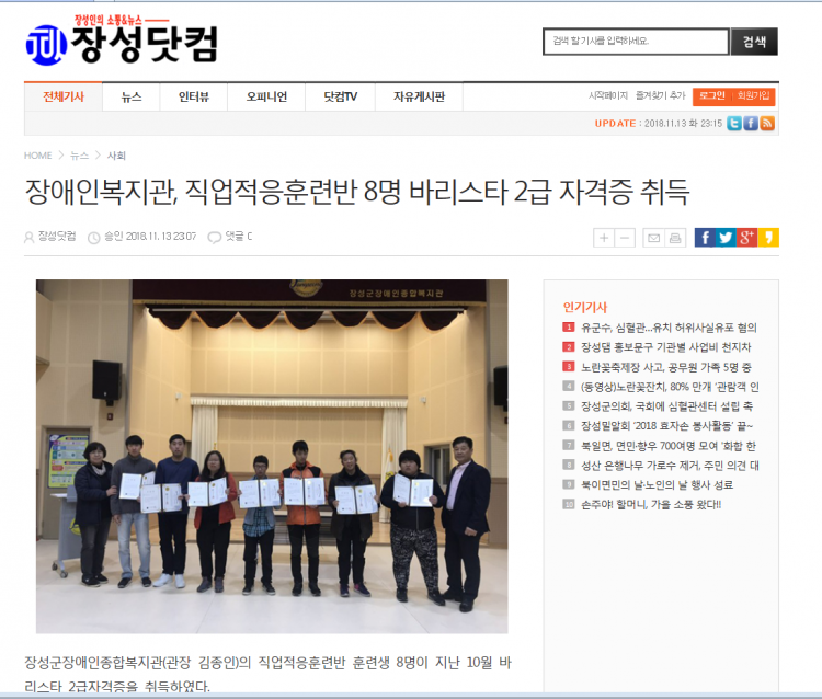 | 이전글 일등방송-장성군장애인종합복지관, 이용자 커피 바리스타 2급자격증 취득!!! |