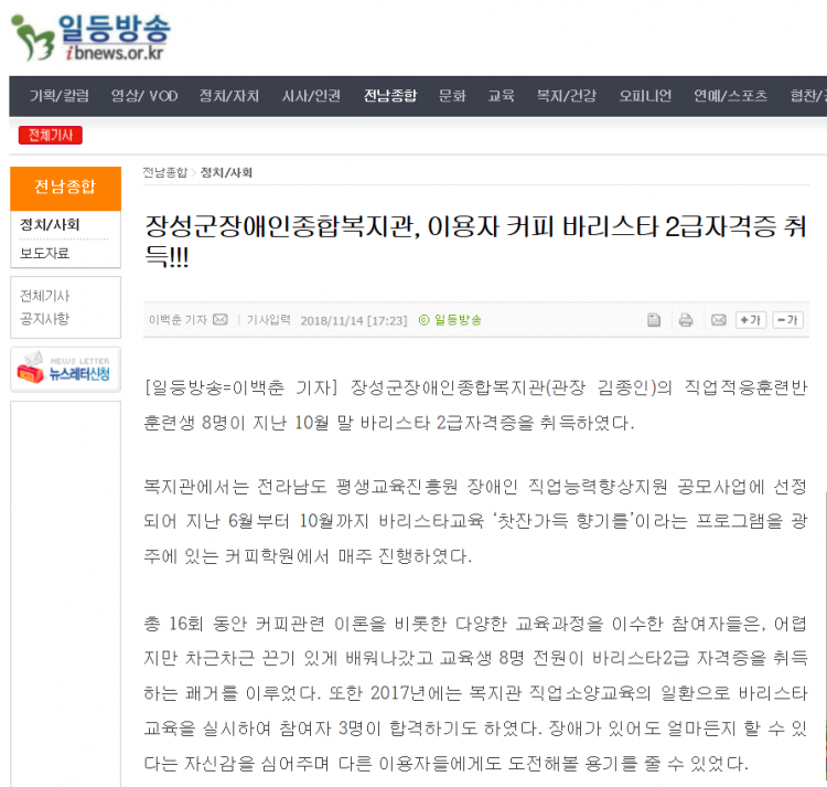 | 이전글 광남일보-장성 직업적응훈련생 8명, 커피 바리스타 2급자격증 취득 |