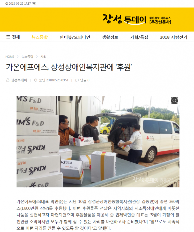 ◎기사명 : 가온에프에스, 장성군장애인종합복지관에 '후원’