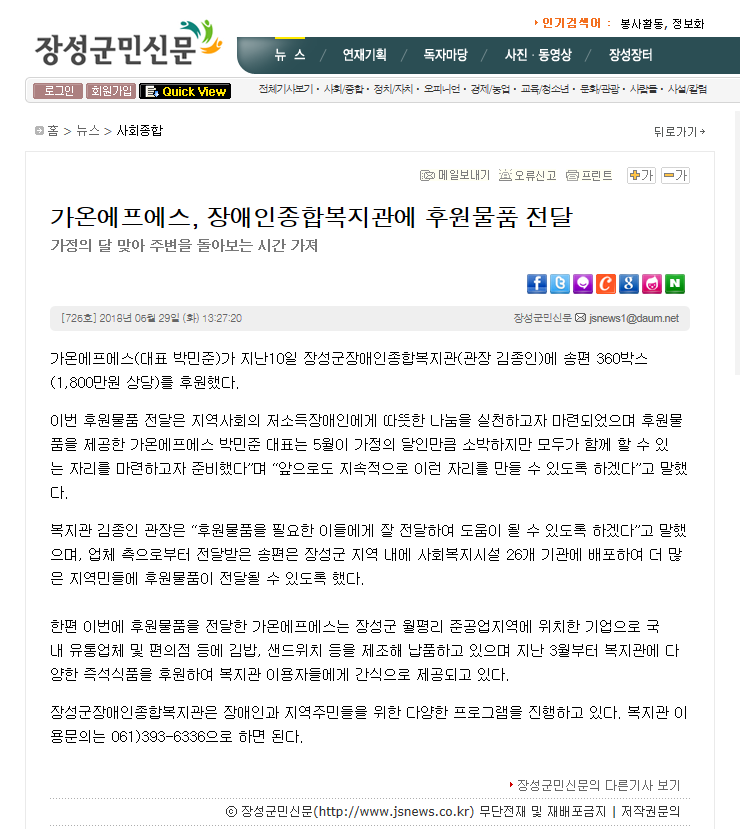 | 이전글 우리군민신문-가온에프에스, 장성군장애인종합복지관에 송편360박스 전달 |