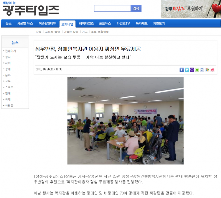 ◎ 기사명 : 상우반점, 장애인복지관 이용자 짜장면 무료제공
