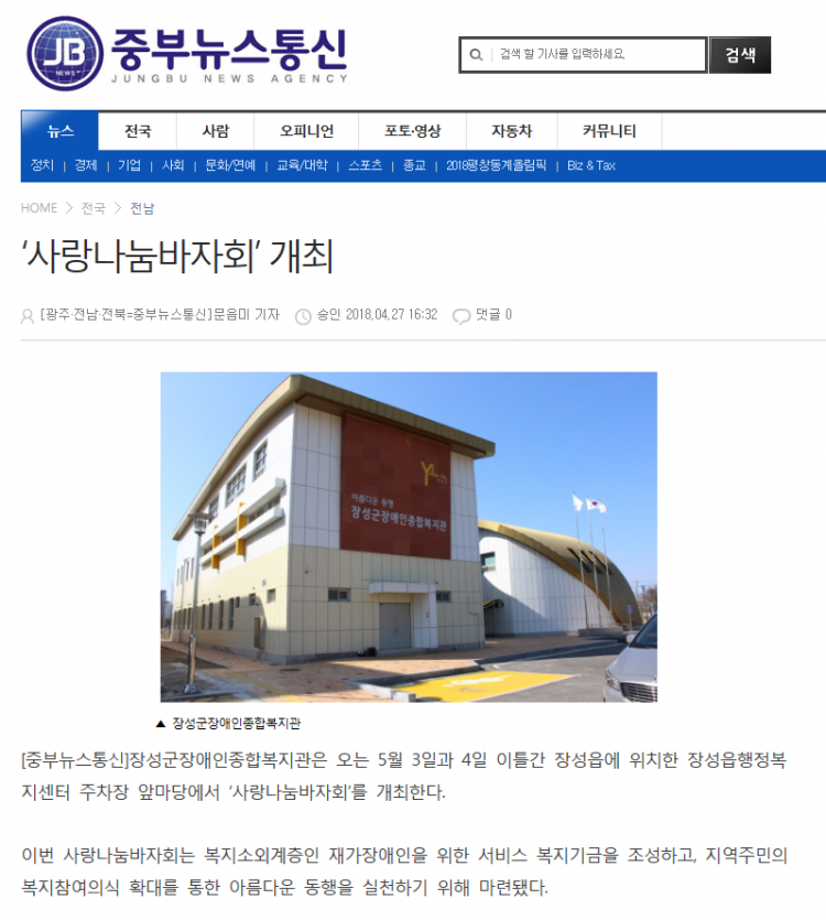 | 다음글 인터넷핫뉴스-장성군 장애인종합복지관, ‘사랑나눔바자회’ 개최 |