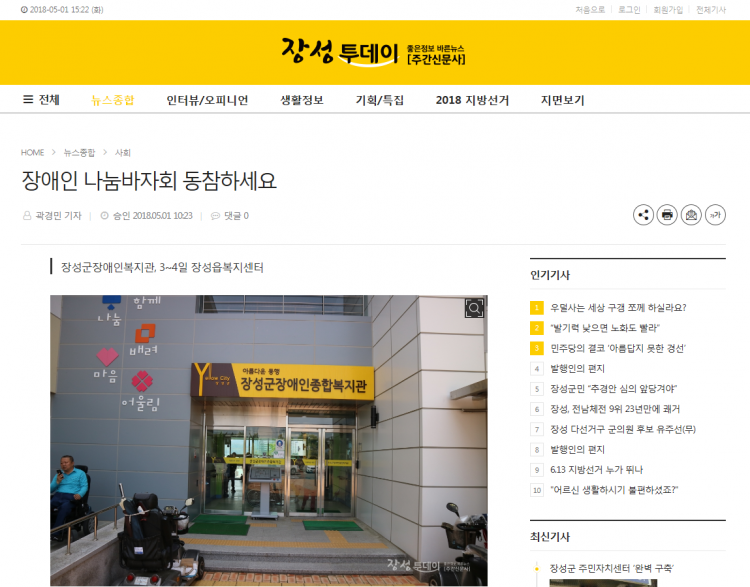 ◎배포일 : 2018.05.01.화◎게재현황 : 장성투데이