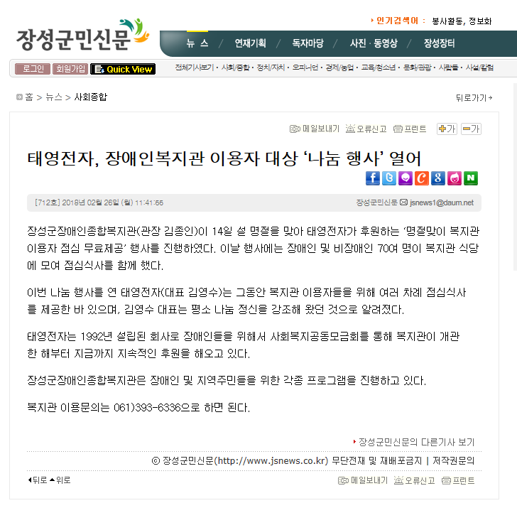 장성군민신문-태영전자, 장애인복지관 이용자 대상 ‘나눔 행사’ 열어