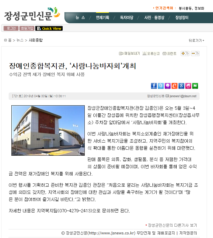 장성군민신문-장애인종합복지관, ‘사랑나눔바자회’개최